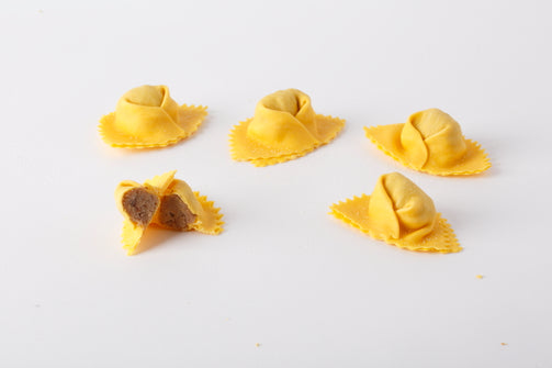 Ingredienti: FARINA DI GRANO TENERO TIPO "00", SEMOLA DI GRANO DURO, UOVA. Ripieno: anatra, spalla di manzo, carne di maiale, prosciutto crudo ( coscia di suino, sale,